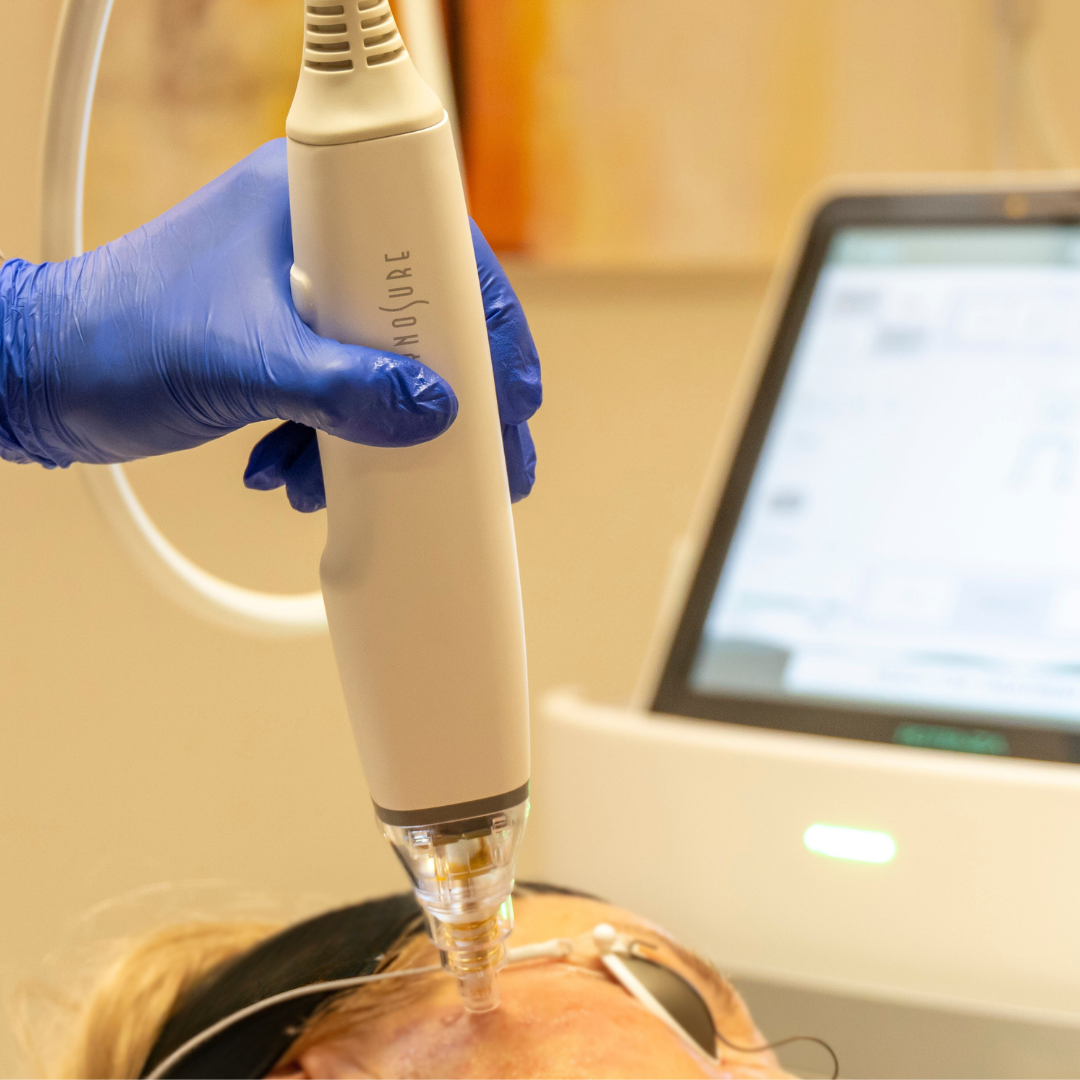 Le professionnel utilise la technologie Potenza, qui combine le microneedling et la radiofréquence fractionnée. Les micro-aiguilles créent des micro-perforations précises tandis que l’énergie de radiofréquence stimule en profondeur la production de collagène et d’élastine.